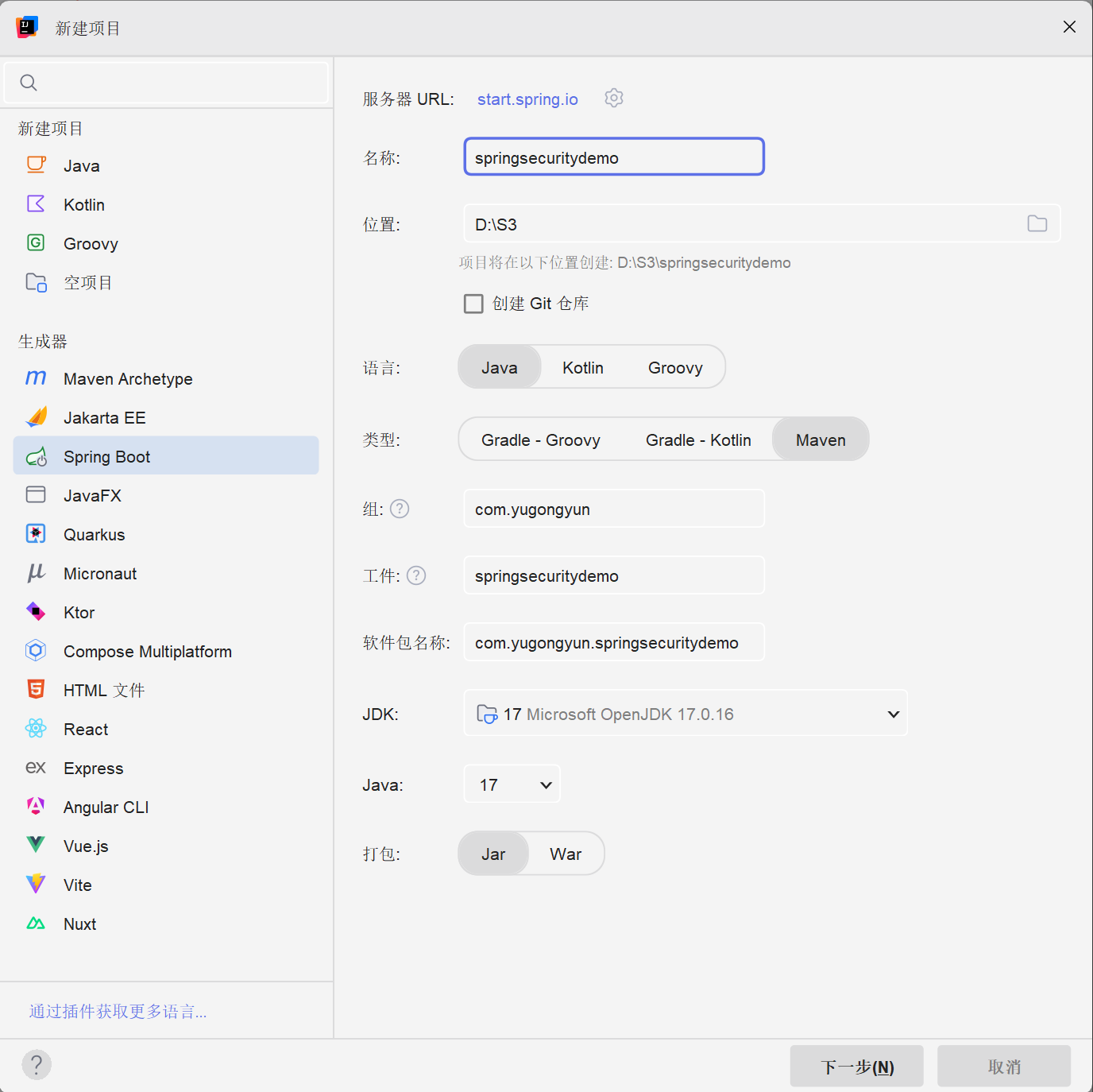 创建名为SpringSecurityDemo的SpringBoot项目,填写项目的信息后点击下一步: